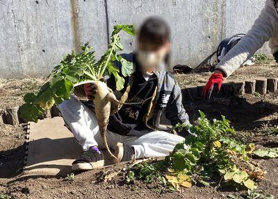 給食の食材提供を目指し、昨年10月に蒔いた小さな種。生徒たちは寒さに負けず、水やりや除草作業に粘り強く取り組んできました。そして2月5日、ついに立派な大根を収穫しました。自分たちの手で育てた大根を持つ生徒たちの笑顔は、最後までやり遂げた大きな達成感と喜びに輝いていました。