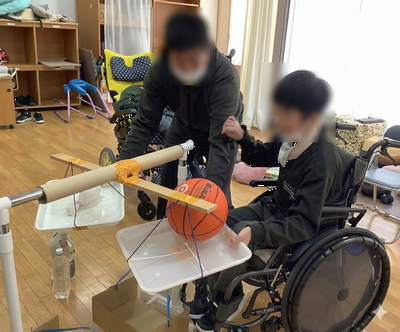 高等部1・2班の体育では、ネットの下でボールを転がす「ゴロバレー」をしています。どこをねらえば得点になるのかを考えてサーブしたり、パスからアタックの連携プレーで点を決めたりすることができました。