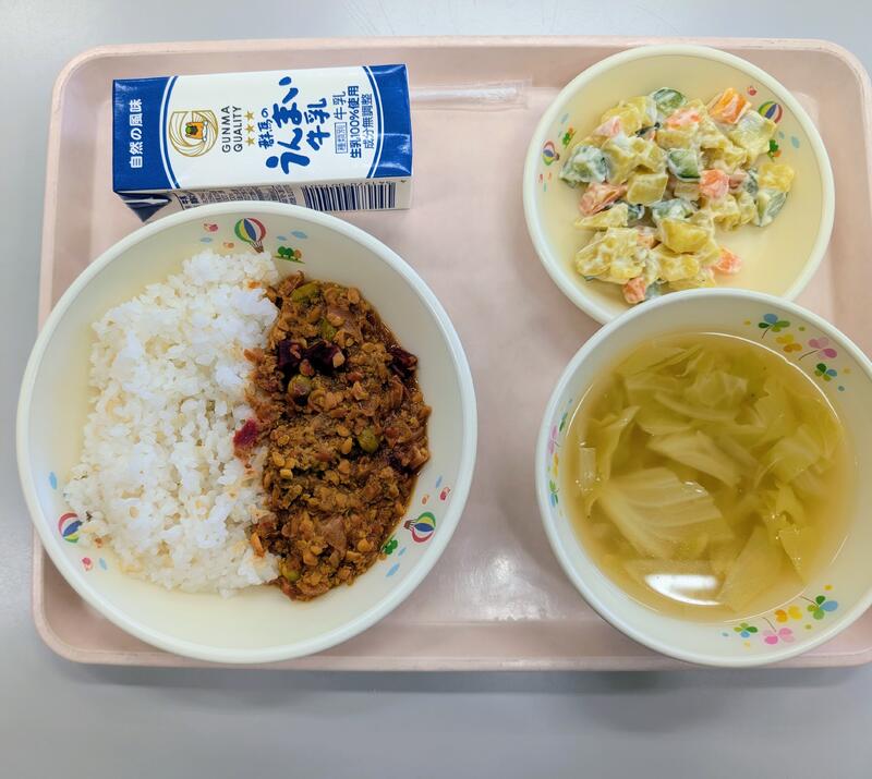 有機玄米ごはん、ビーツ入りドライカレー、さつまいものサラダ、キャベツのスープ、牛乳