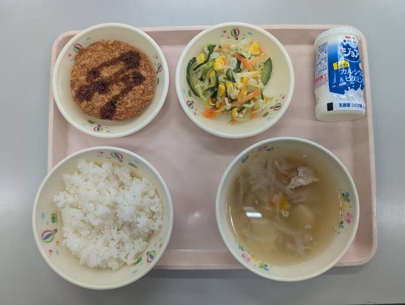 ごはん、ぐんまのねぎこんコロッケ、だいこんの煮付け、はくさいのみそ汁、牛乳